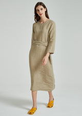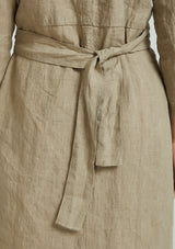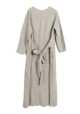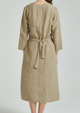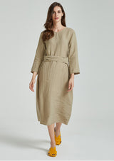 This neat-cutting linen dress exudes a feeling of concise fashion. The belt can be fastened in different ways for different looks.